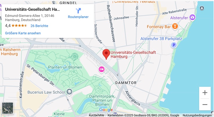 Die Universitäts-Gesellschaft befindet sich im Hauptgebäude der Universität Hamburg gegenüber dem Bahnhof Dammtor.