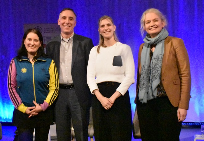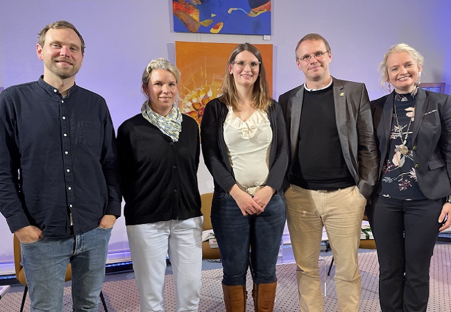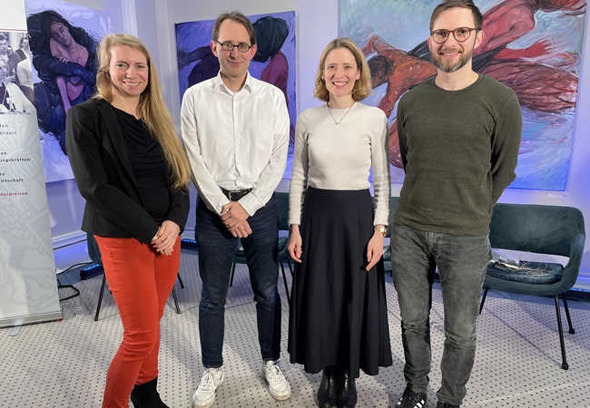 Doktorand:innen aus dem Bereich der Klimaforschung diskutieren mit einem Vertreter der Wirtschaft.